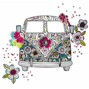 A beautiful Henna style Campervan greetings card with faux jewelled centre. Measuring approx 5" x 5" and with blank space inside for your personal message, this Camper card is perfect for birthday, thank you or other personal messages or greetings.