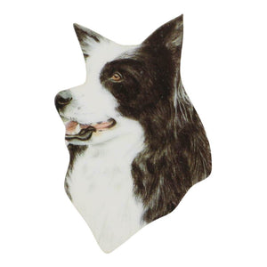 Handmade in the UK this Border Collie sheepdog image fridge magnet is hand cut from compressed wood and featuring a striking head image of the black and white collie dog.