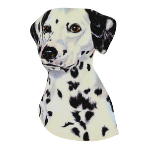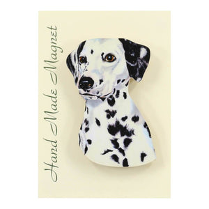 Handmade in the UK this black and white spotted Dalmation image fridge magnet is hand cut from compressed wood and featuring a striking head image of the spotty dog.