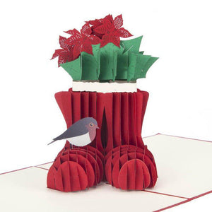 Looking for that truly unique Christmas card that is sure to impress. This Santa Boots with Christmassy Poinsettia Pop Up Card features a pair of Father Christmas boots with flowers inside and a cute robin perched on the front of the boots.