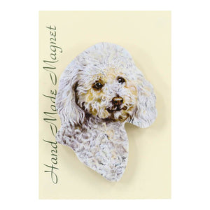 Handmade in the UK this Poodle image fridge magnet is hand cut from compressed wood and featuring a striking head image of the white poodle dog.