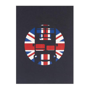 On the front of the card is printed a silhouette of the front of a bus on a Union Jack background.
