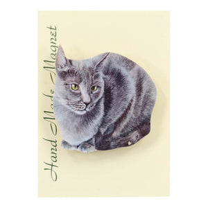 Handmade in the UK this Russian Blue cat image fridge magnet is hand cut from compressed wood with the sitting cat image on one side.