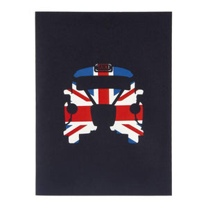 On the front of the card is printed a silhouette of the front of a Taxi on a Union Jack background.