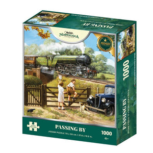 This premium 1000 pcs jigsaw puzzle features the image of a vintage steam train LNER 4791 Class V2 Steam Train locomotive with an Austin 7 Ruby in the foreground, by renowned artist Kevin Walsh.